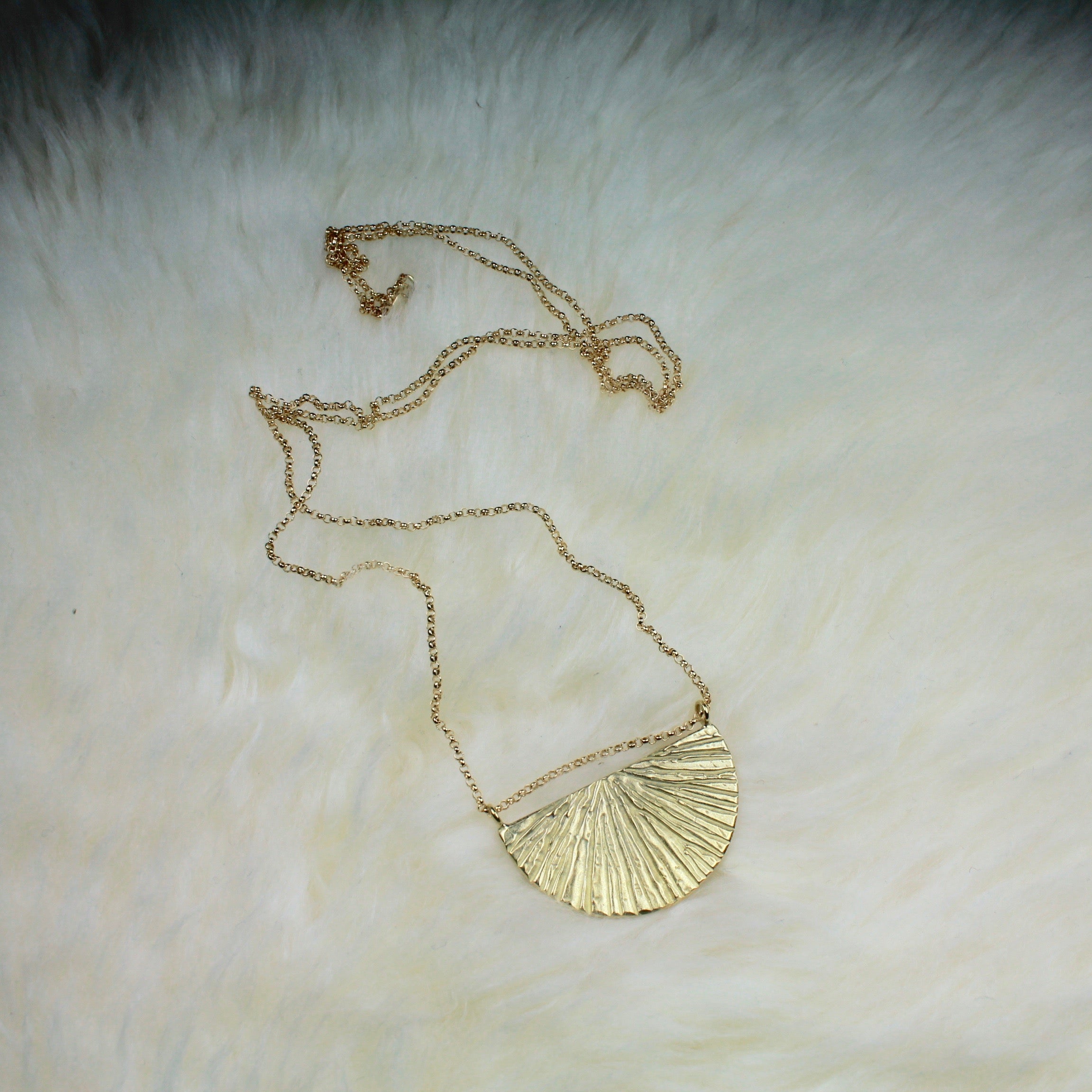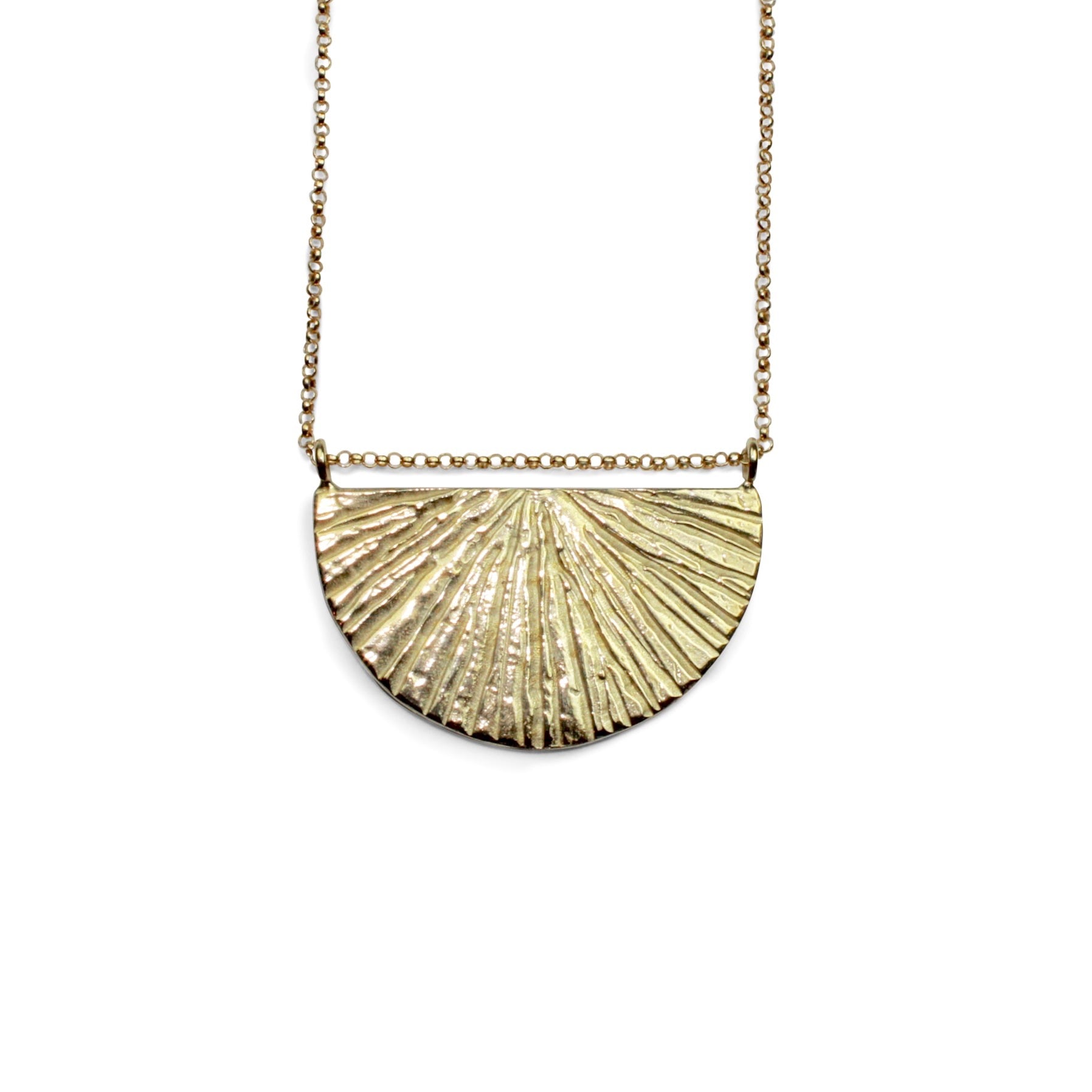 Enjoy our representation of the transition into the day with detailed bronze and a sexy arc. This horizontal pendant layers well, perfect for everyday.