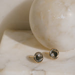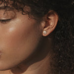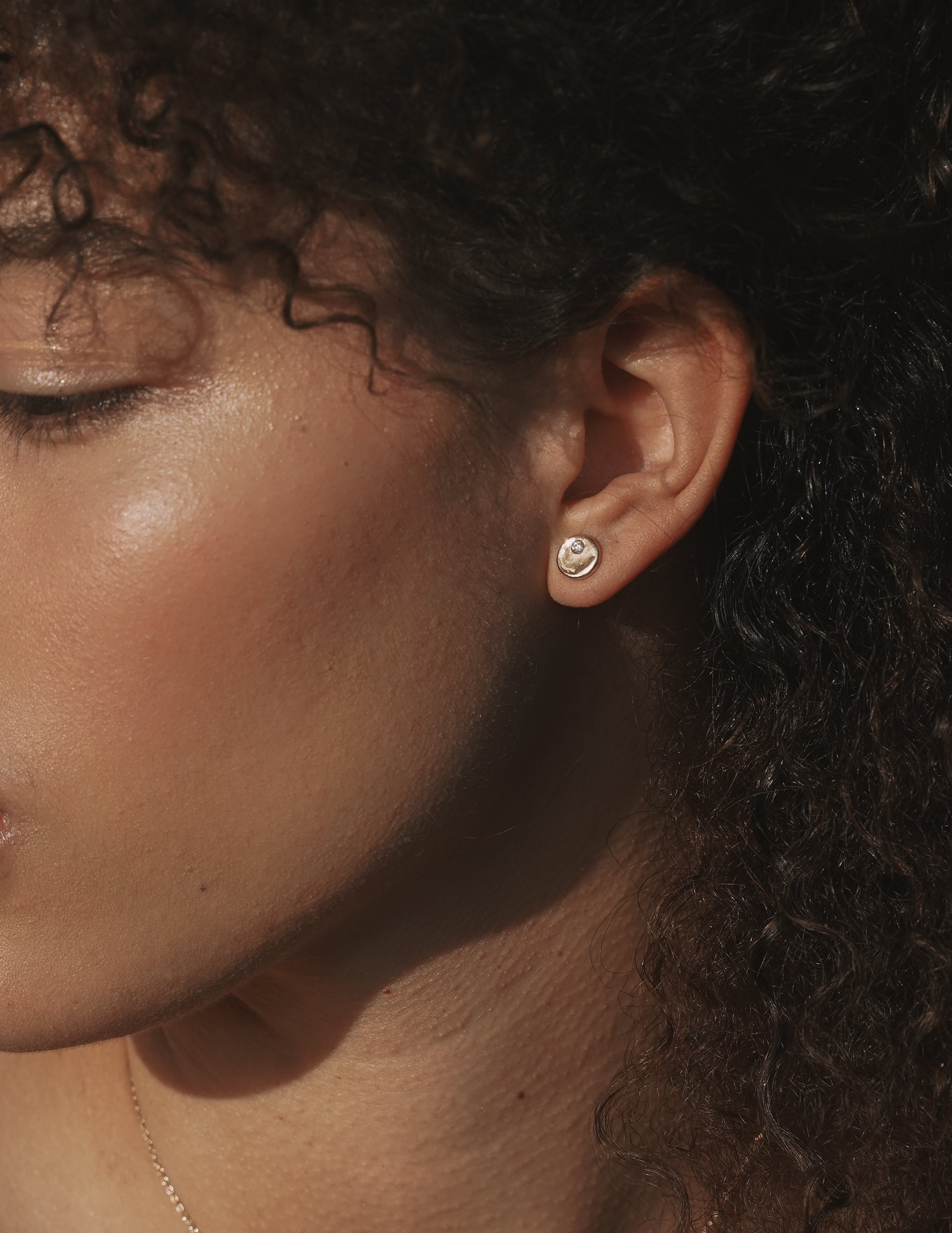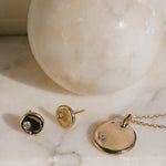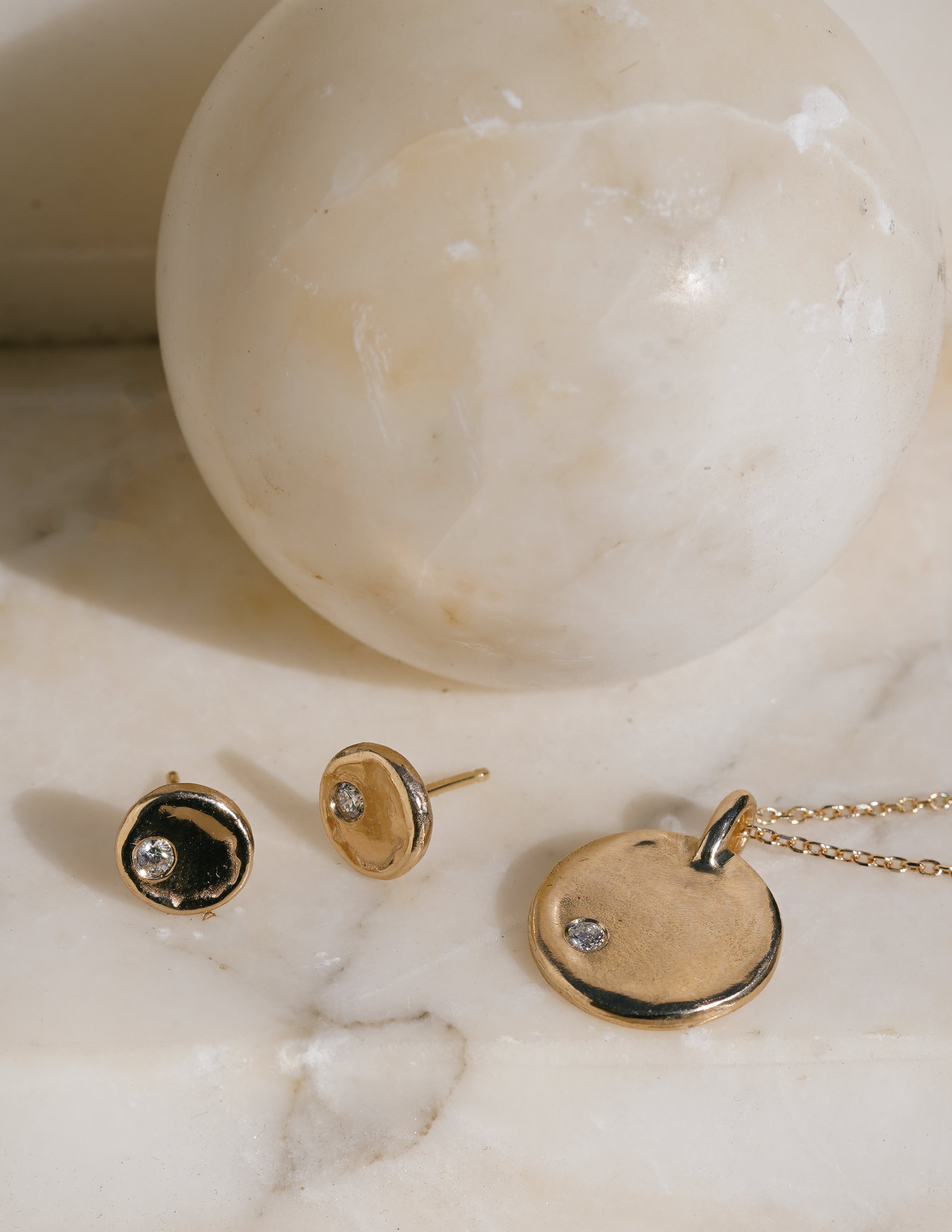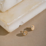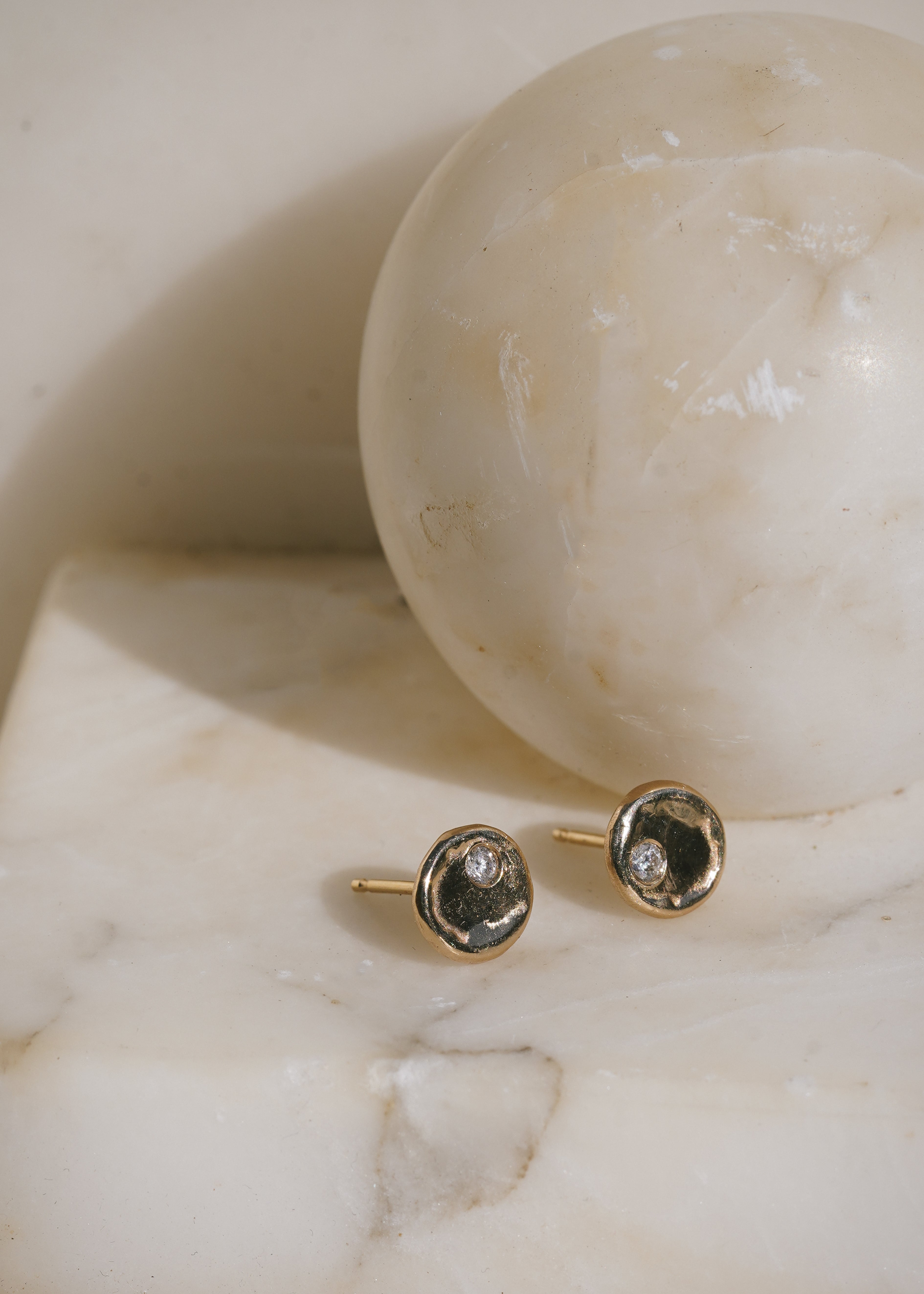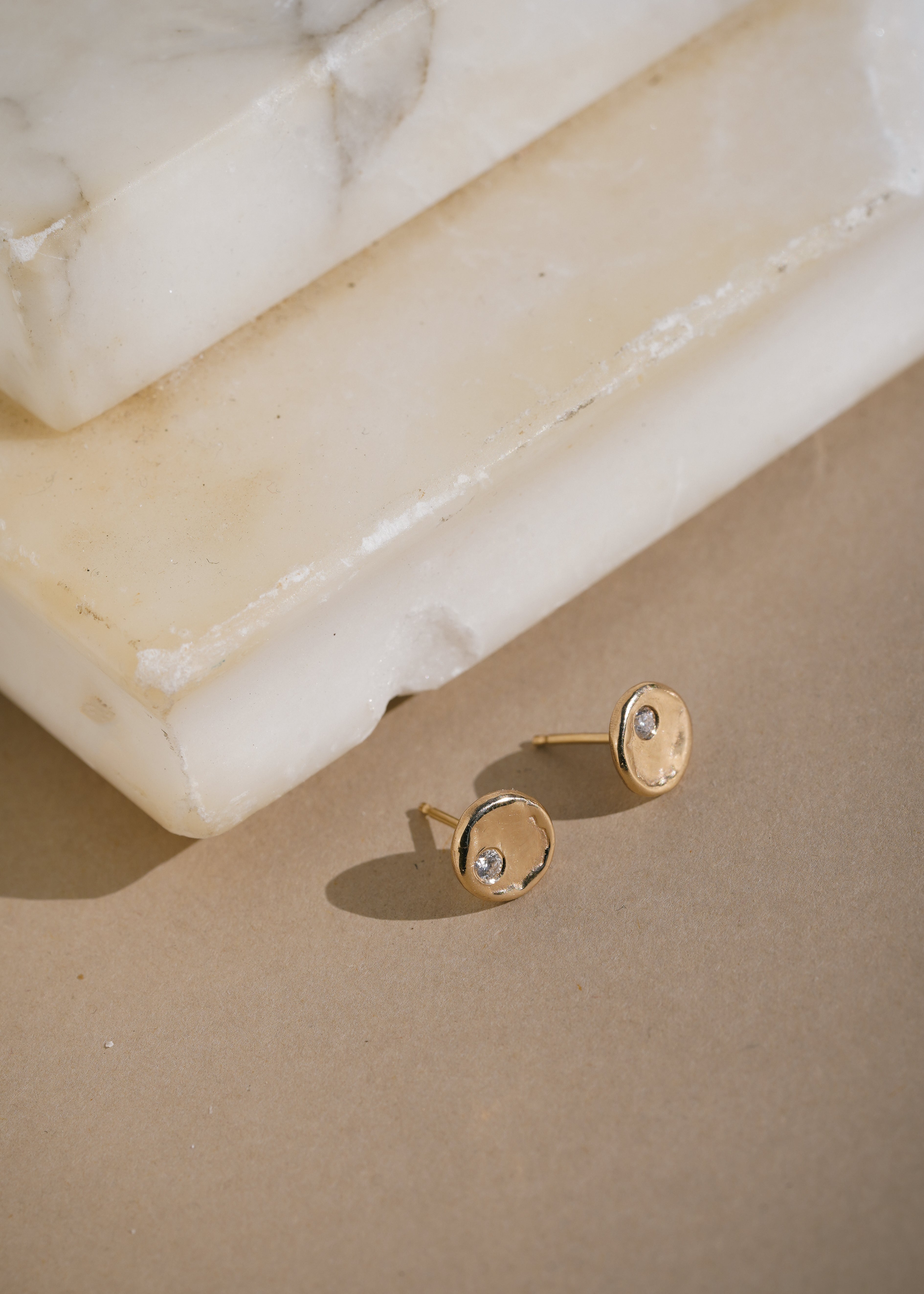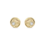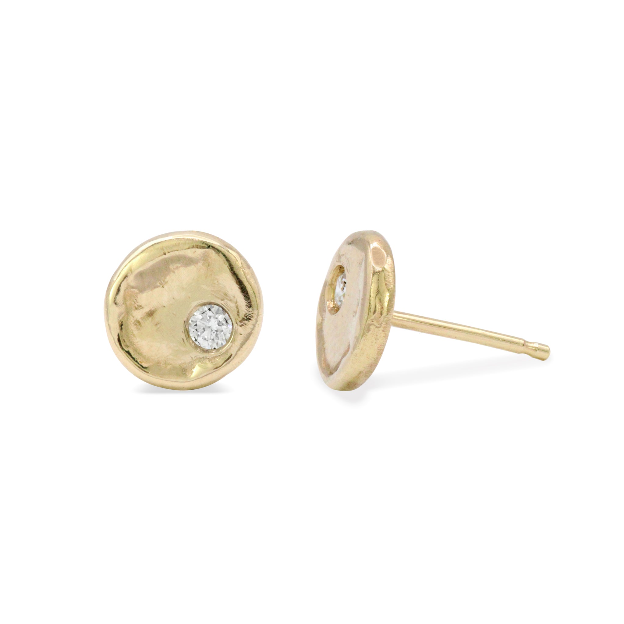 Gold coin studs with offset diamonds.  Perfect for everyday.