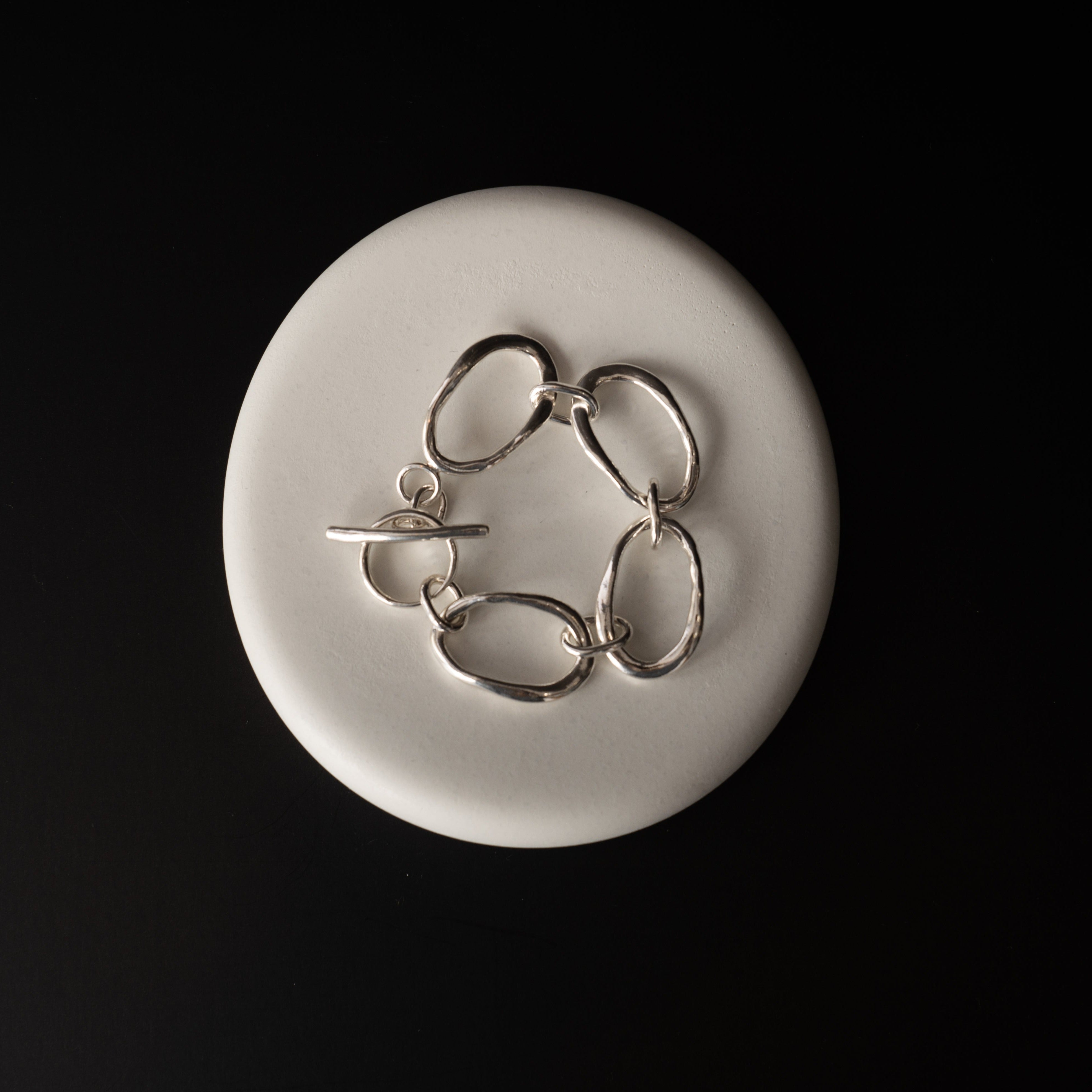 Secured with a toggle and ring clasp, this bracelet not only offers a secure closure but also adds a touch of sophistication to the overall aesthetic. Every detail is meticulously crafted by hand in solid sterling silver, ensuring a one-of-a-kind piece that exudes artistry and elegance.