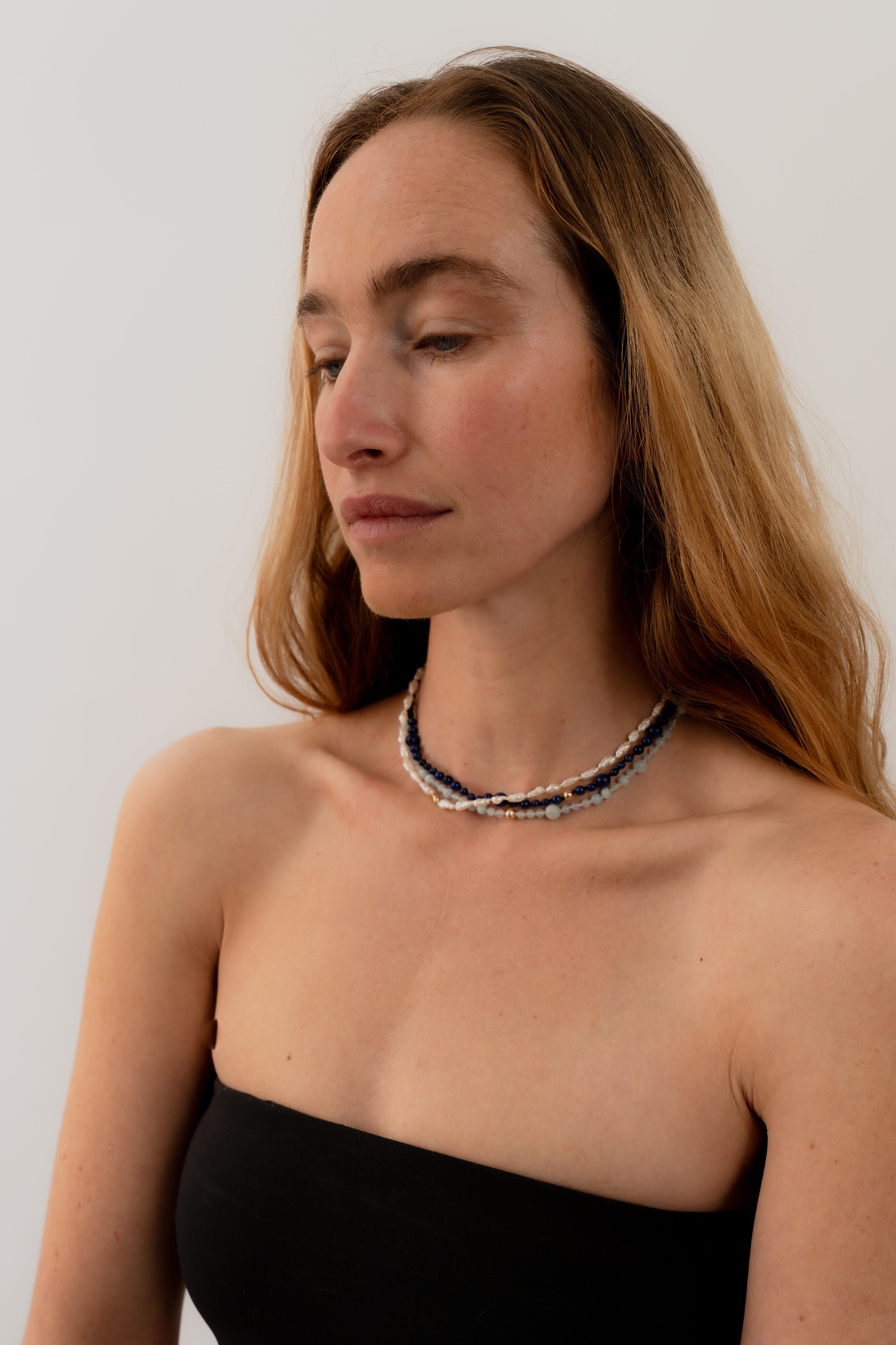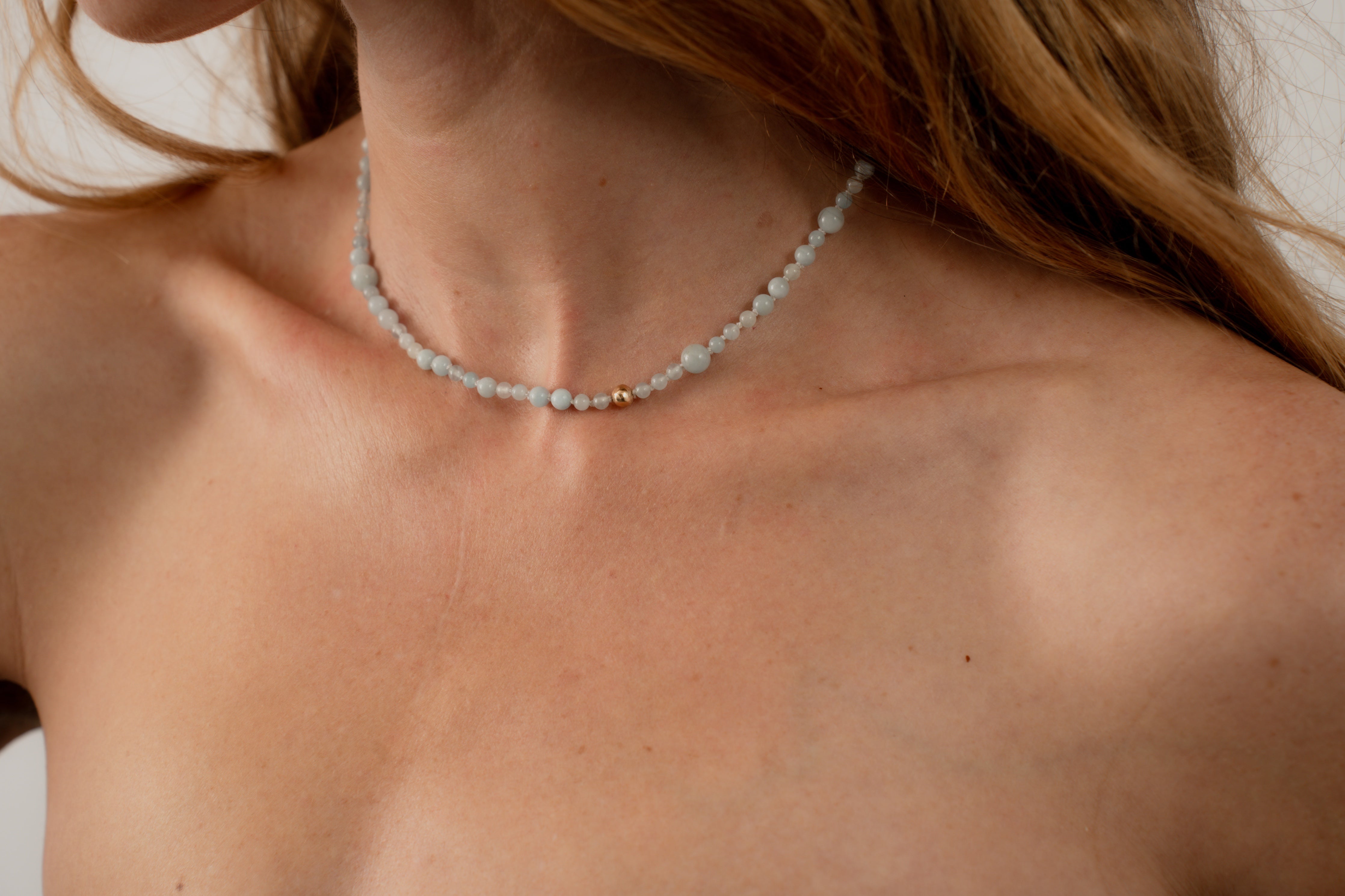 Inspired by the tranquil blues of the Aegean Sea, The Aquamarine Intention Necklace captures the serene depth of the ocean, evoking a sense of calm and inner peace. Aquamarine was considered a sacred stone of the sea gods, often carried by sailors to ensure safe travels and protect against storms. Aquamarine is a stone of harmony, balance, and clarity to the wearer, promoting peace of mind and emotional healing.